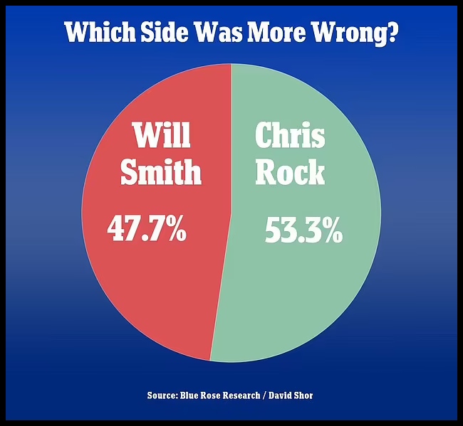 Menurutnya, 52.3 peratus (52.3%) orang mengatakan Chris Rock layak mendapat apa yang dia dapat selepas bergurau tentang keguguran rambut isteri Smith.