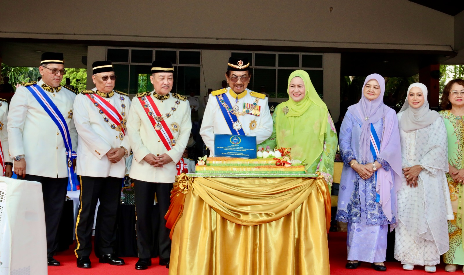 Sebaik tiba, lagu Negaraku dan Sabah Tanah Airku dimainkan diikuti tembakan meriam 17 das sebagai tanda penghormatan, sebelum TYT menerima tabik hormat diraja dan memeriksa Kawalan Kehormatan Utama.