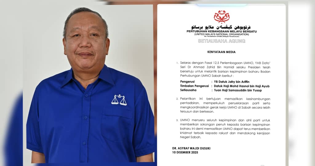 KOTA KINABALU: Setiausaha Agung UMNO, Datuk Dr. Asyraf Wajdi Dusuki, memaklumkan bahawa Presiden UMNO, Datuk Seri Dr. Ahmad Zahid Hamidi telah bersetuju melantik barisan kepimpinan baharu Badan Perhubungan UMNO Sabah selaras dengan Fasal 12.5 Perlembagaan UMNO.