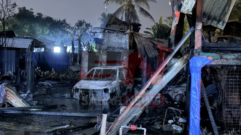 PUTATAN: Lapan buah rumah dan sebuah kenderaan Perodua Kancil musnah dalam satu kejadian kebakaran yang berlaku di Jalan Sekambu, Kampung Sekambu Petagas, di sini, petang tadi.