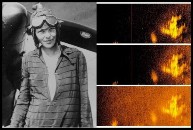 Gambar: Amelia Earhart dan Imbasan sonar didakwa pesawat Earhart (Sumber: Deep Sea Vision)