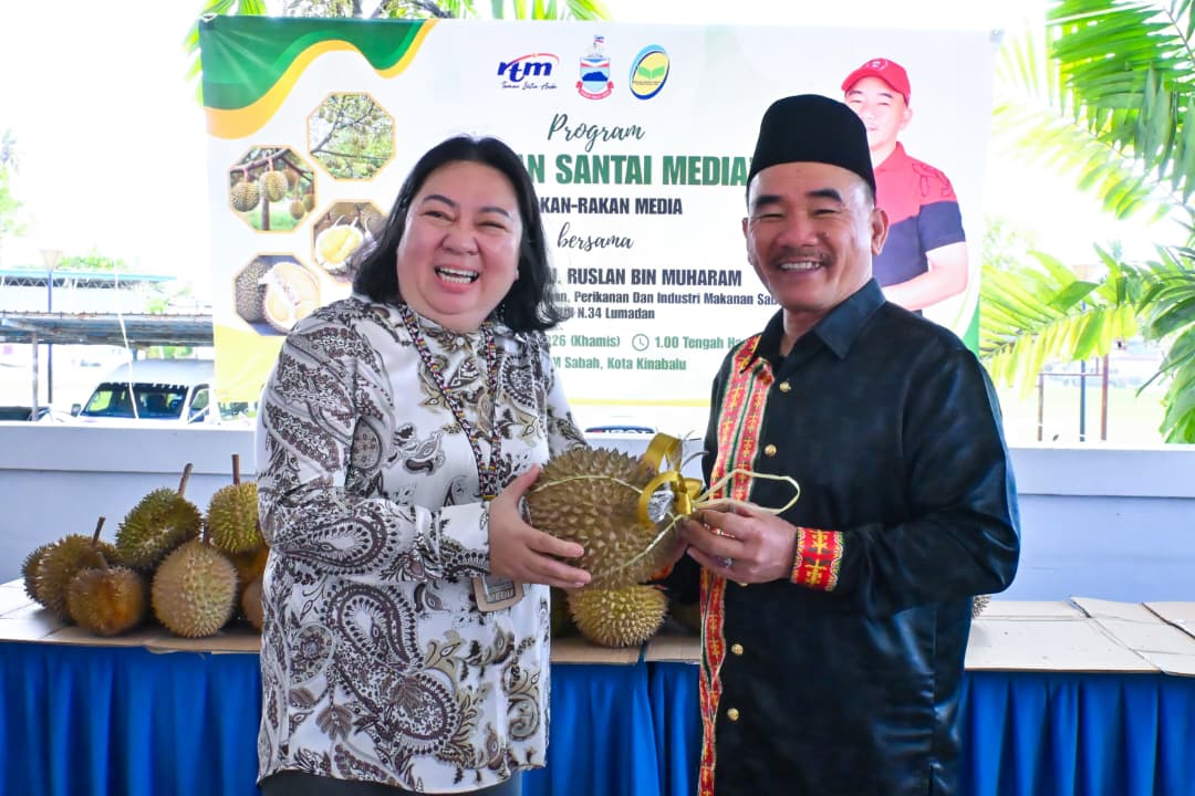 KOTA KINABALU: Penolong Menteri Pertanian, Perikanan dan Industri Makanan Sabah merangkap ADUN Lumadan, Datuk Ruslan Muharam berkongsi lebih 1.2 tan durian, dianggarkan antara 500 hingga 900 biji, bersama pengamal media dalam program “Santai Media Durian” di RTM Sabah, sempena lebihan bekalan durian ketika ini.