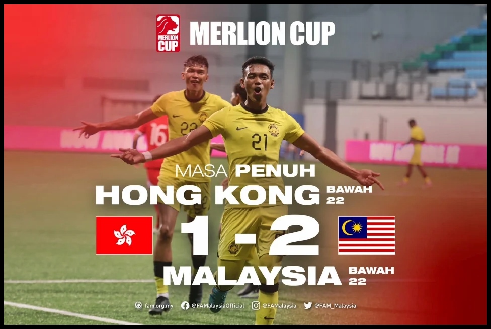 KUALA LUMPUR – Skuad Bawah 22 tahun (B-22) negara menjulang Piala Merlion buat kali pertama selepas menewaskan skuad B-22 Hong Kong 2-1 di Stadium Jalan Besar, Singapura, sebentar tadi.