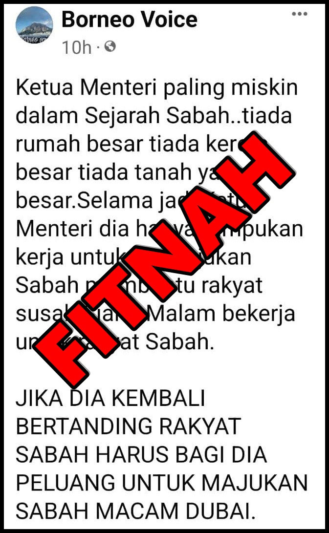 Kami menulis surat ini selepas tular FITNAH yang dimuat naik di media sosial Facebook milik ‘Borneo Voice’ di antaranya berbunyi Ketua Menteri paling miskin dalam Sejarah Sabah.. tiada rumah besar tiada kereta besar tiada tanah yang besar. Selama jadi Ketua Menteri dia hanya tumpukan kerja untuk memajukan Sabah membantu rakyat susah. Siang Malam bekerja untuk rakyat Sabah.”